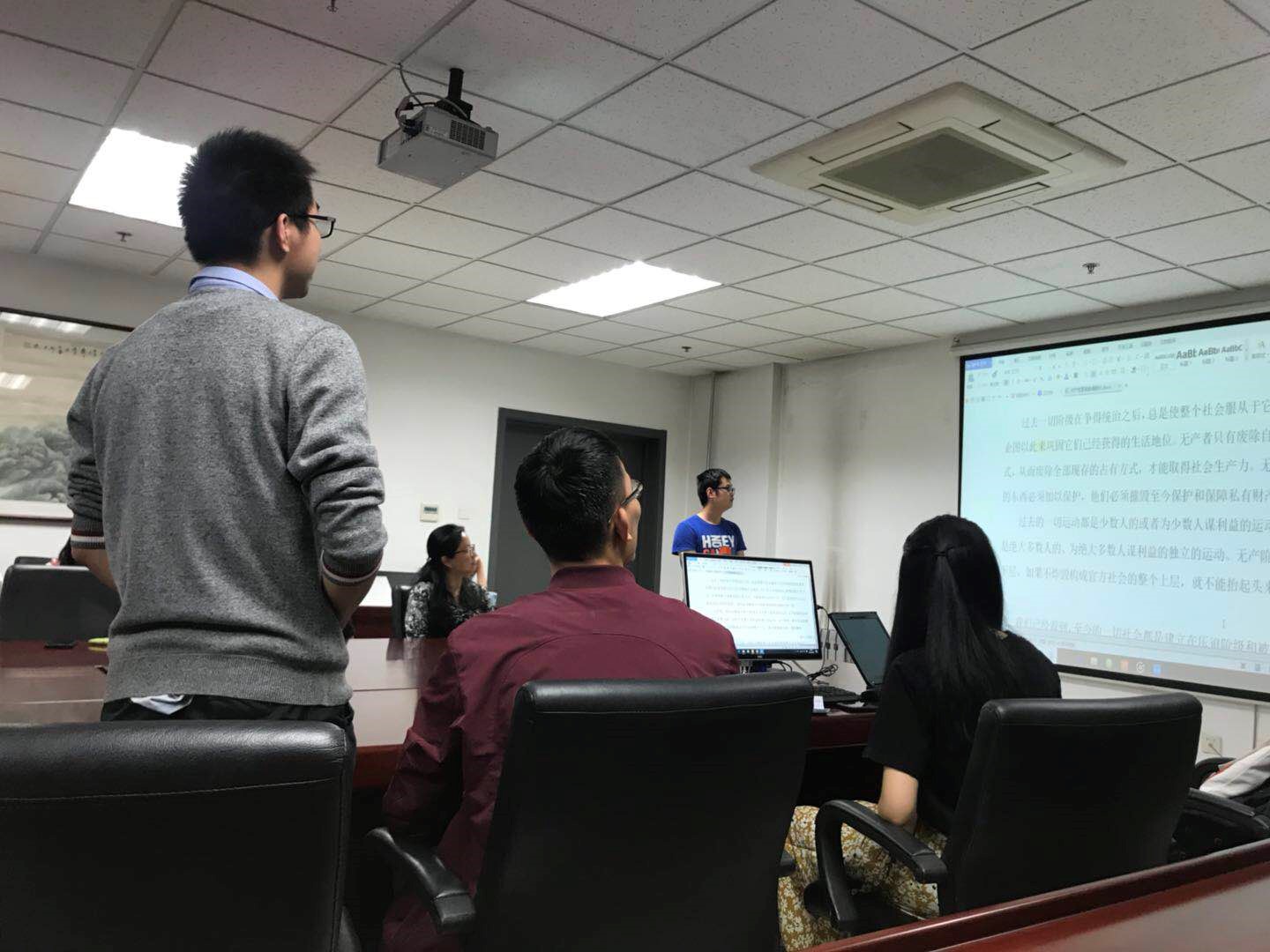 硕7016党支部联合外语院党支部在外语楼912室组织了一场“中外思想荟 语贯中西 经典诵读”活动。为了丰富校园文化生活,陶冶工科学院的学生情操,感受中华五千年经典文化的魅力,开展毛泽东经典诗集的中英法三种语言朗诵活动,共同学习共产党宣言,提升大家党性觉悟。