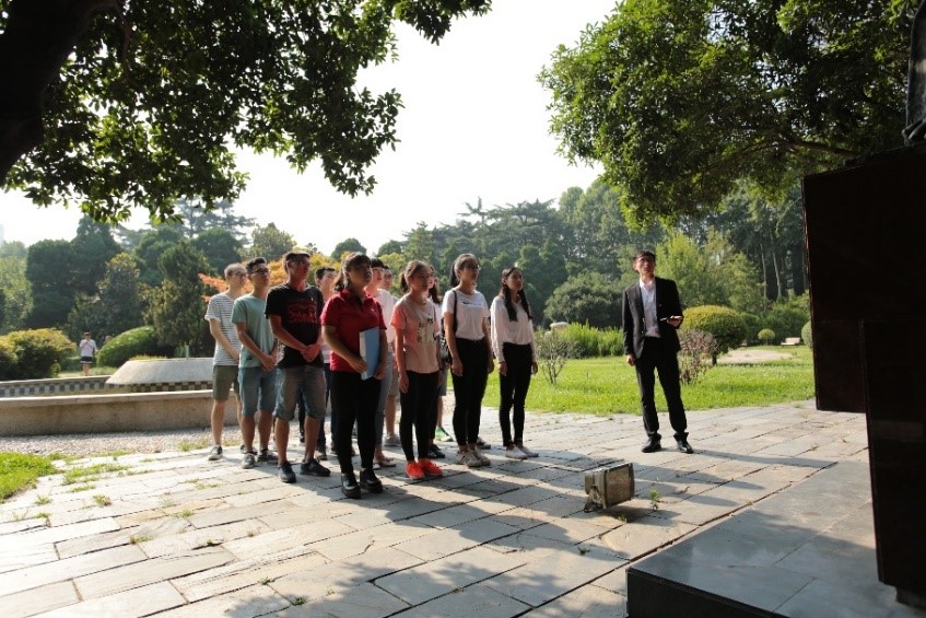 预备党员同志们佩戴党徽后,怀着无比崇敬的心情,整齐地站立彭康校长雕像前,齐唱国歌。