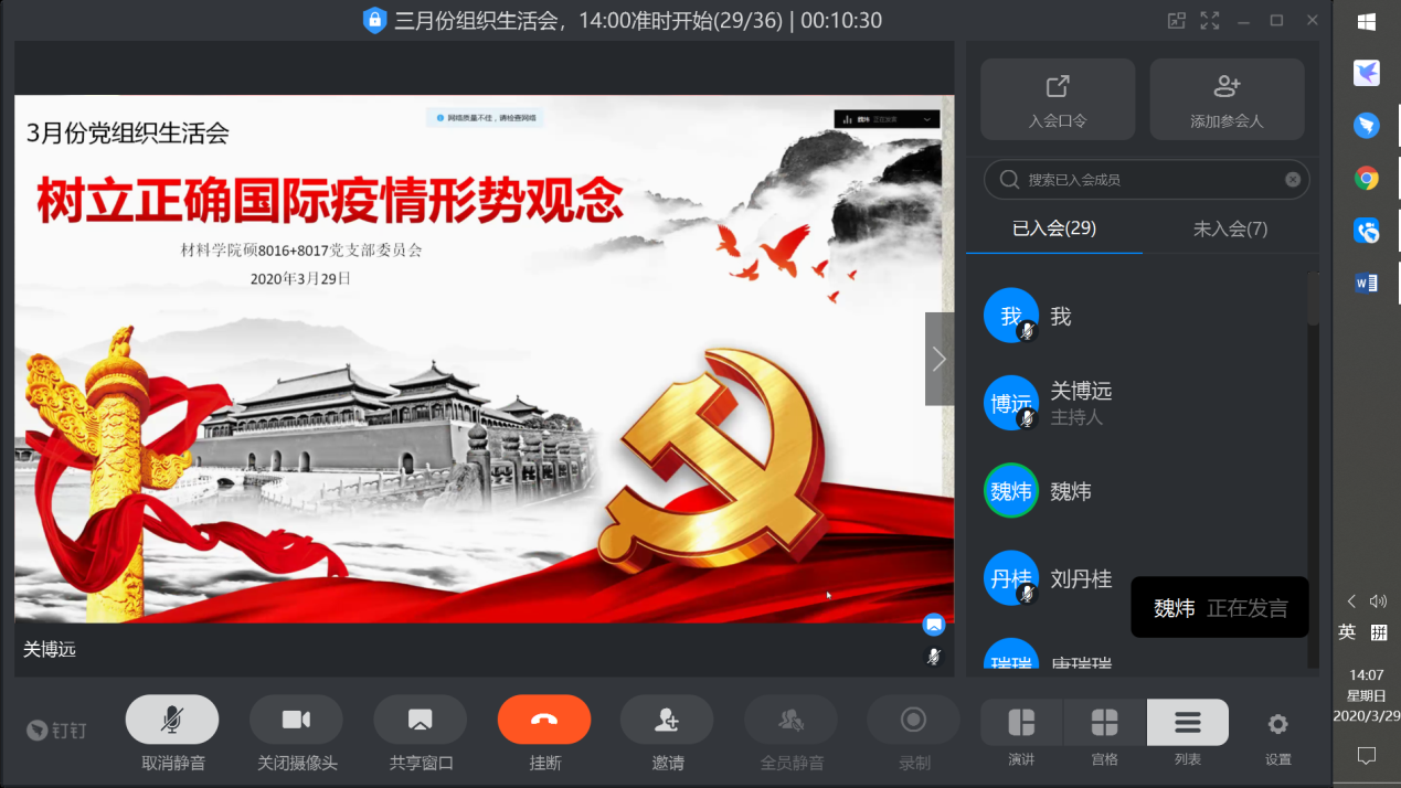 3月29日,硕8016+8017党支部开展了以“树立正确国际疫情形势观念”为主题的支部生活会。受疫情限制,此次会议依然采用了以钉钉为平台的线上会议模式。会议由支部书记关博远主持,支部党员、积极分子参与了会议;会议特别邀请了8X8X