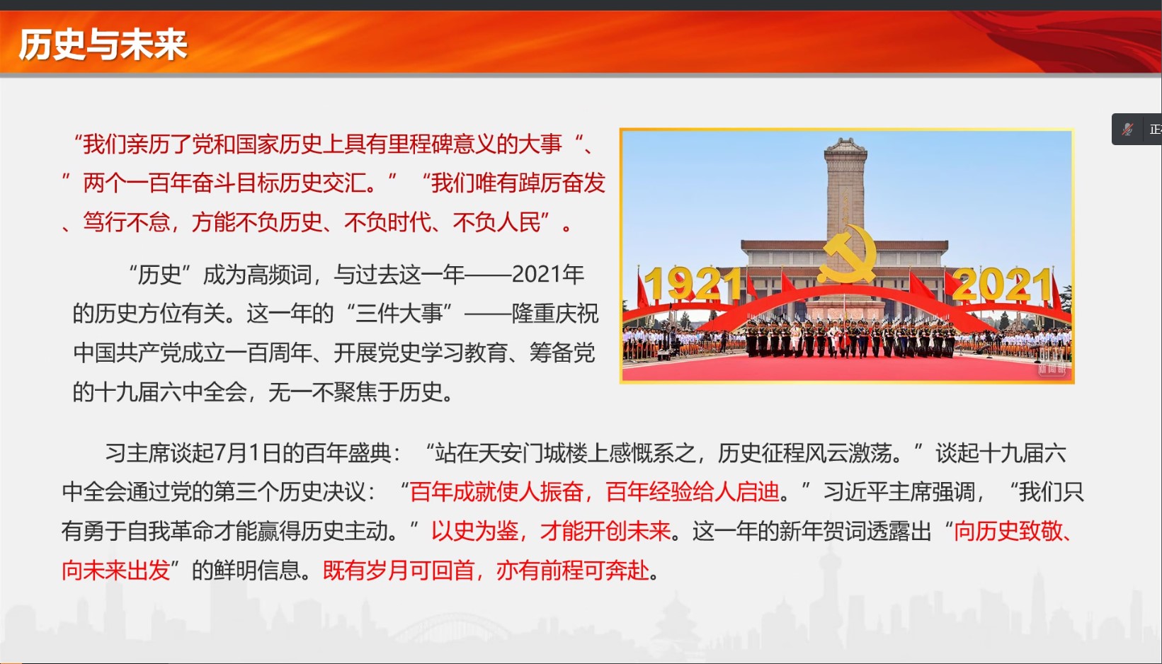 接着,宣传委员王佩同志带领支部成员学习习近平总书记新年贺词。习近平总书记在新一年的贺词中透露出“向历史致敬,向未来出发”的鲜明信息,此外还强调来自基层,才更能理解基层,来自人民,方能不负人民。