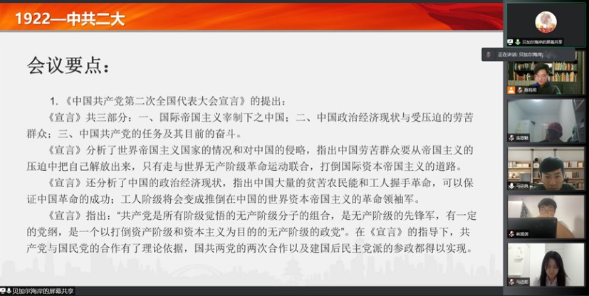 随后,党史学习第二小组陈圣捷同志分别就会议开展时间、地点、内容、要点及召开意义等几个方面带领大家学习了中共二大、中共三大和中共四大,系统地进行党史学习和知识梳理。