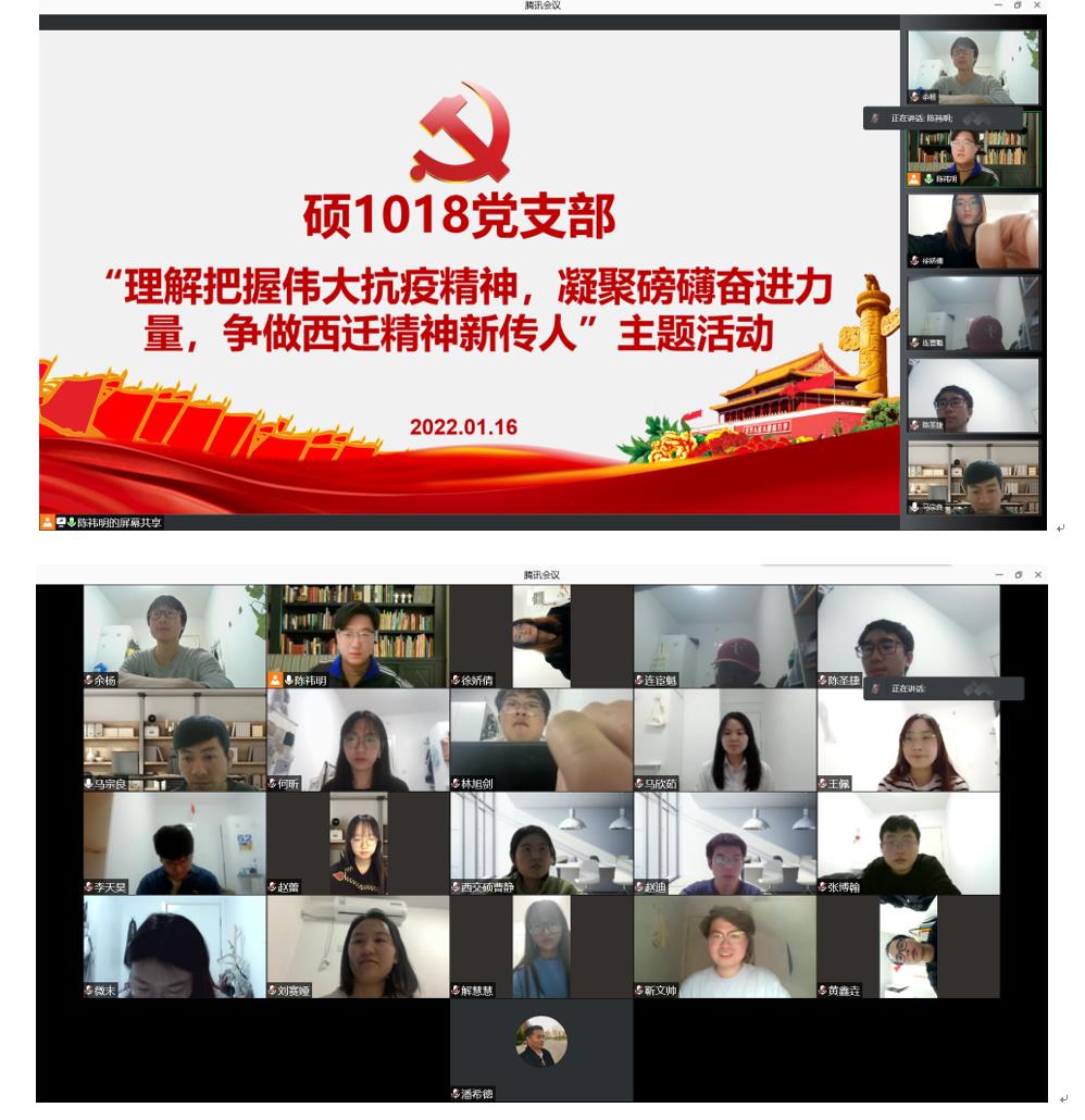 1月16日晚7点,硕1018党支部在线上开展党日主题活动——“理解伟大抗疫精神,凝聚磅礴奋进力量,争做西迁精神新传人”。会议旨在充分发挥党支部战斗堡垒作用和党员的先锋模范作用,保障教学科研等工作平稳运转。支部全体党员和积极分子参加本次会议,会议邀请8X8X