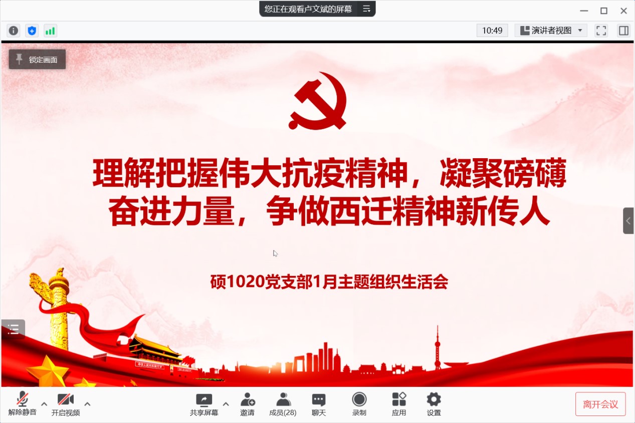 硕1020党支部召开“理解把握伟大抗疫精神,凝聚磅礴奋进力量,争做西迁精神新传人”主题组织生活会议。支部全体成员参加会议,会议由党支部书记卢文斌主持。8X8X