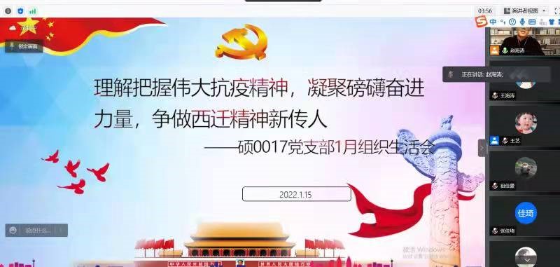 硕0017党支部在线上召开了“理解把握伟大抗疫精神,凝聚磅礴奋进力量,争做西迁精神新传人”主题组织生活会议,议由党支部书记赵海涛主持,8X8X