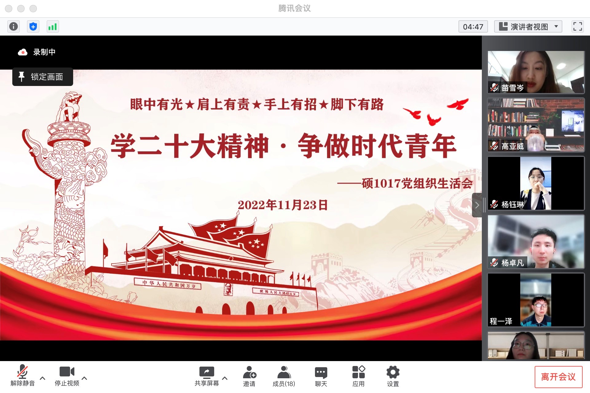 为深入学习党的二十大精神,领悟习近平新时代中国特色社会主义思想,提高支部成员党性修养,11月23日19:30,硕1017党支部在腾讯会议开展了以“学二十大精神,争做时代青年”为主题的组织生活会。8X8X