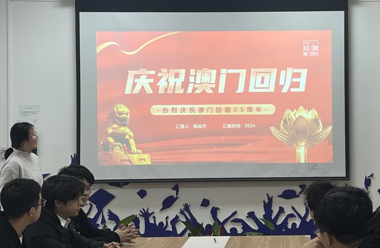随后,韩淑杰同学带领大家回顾了澳门回归这一重大历史事件。她介绍了在澳门回归这一伟大历史过程中,广大党员积极响应党的号召,充分发挥先锋模范作用,参与社会建设、推动民生改善、加强社会治理等先进事迹,呼吁支部党员同志坚定信念,始终如一地拥护、支持“一国两制”方针,维护祖国统一;加强学习,不断提高自身素质和能力水平,以更好地适应和服务于高质量发展的需求。