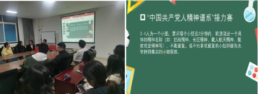 会议伊始,党支部副书记熊家樱作开场发言,阐述了本次学习会的目的与意义。为活跃气氛,会议设置了三个破冰环节。首先进行的是“快速问答接力”。“我是李选聪,来自山东,研究方向是金属材料制备及性能研究,希望未来能为国家科技进步贡献力量!”紧接着,由李选聪指定下一位接力者。会场气氛瞬间活跃,应答声此起彼伏……通过短短几分钟的接力,同志们不仅快速熟悉了彼此的基本信息,更在“我是谁、从哪来、到哪去”的思考中,初步明确了个人发展与国家需要的连接点。随后进行的“寻找共同点:我们的三个共同标签”环节,将现场气氛推向一个小高潮。同志们离开座位,积极寻找身边的的同伴交流。几分钟后,分享环节惊喜不断:“我们发现我们都喜欢《平凡的世界》这本书,都被那种奋斗精神感动”“我们俩都热爱跑步,约好以后一起晨练”……这些超越党员和研究生身份的“共同标签”,迅速增进了同志们之间的亲切感,为后续深入讨论奠定了良好基础。最后,“中国共产党人精神谱系接力赛”将破冰活动与理论学习巧妙衔接。与会党员被分为五组,围绕“中国共产党人的精神谱系”主题展开激烈角逐。“长征精神”“延安精神”“抗战精神”“‘两弹一星’精神”“载人航天精神”“脱贫攻坚精神”……各组队员争分夺秒,群策群力,展现了对党的伟大精神的深刻理解。熊家樱同志在总结中强调,这些精神是激励我们不断前进的宝贵财富,并引出了本次核心学习的内容。