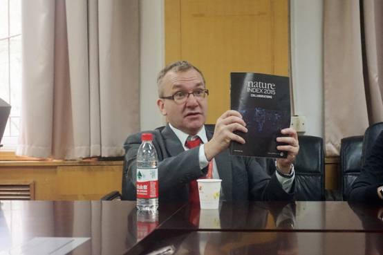 Nick Campbell博士在座谈会上介绍了Nature出版集团在全球的业务及推广情况,包括科研评估体系Nature Index、Nature合创期刊(npj)、Nature大师班等项目。Campbell博士还提到中国已成为高水平科研成果的主要贡献者,其科研影响力在全球范围内正逐步提升。随后,座谈会进入自由讨论环节,参会的老师与学生们都积极提问,Campbell博士就Nature的审稿流程、投稿文章接受原则等普遍受关注的问题与大家进行了交流。座谈会结尾,参会双方表示将就合创期刊事宜进行进一步讨论。