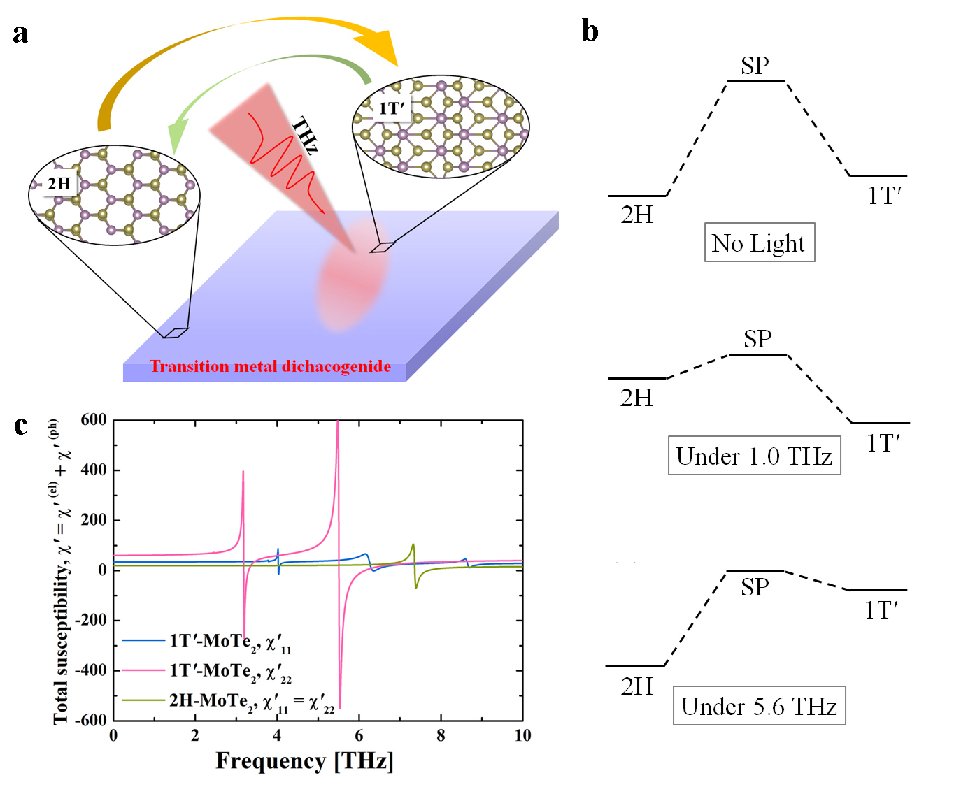 图2 a. 太赫兹光照诱导MoTe2材料的拓扑相变;b. 光照对材料吉布斯自由能和相稳定性的调控;c. 太赫兹光响应函数。