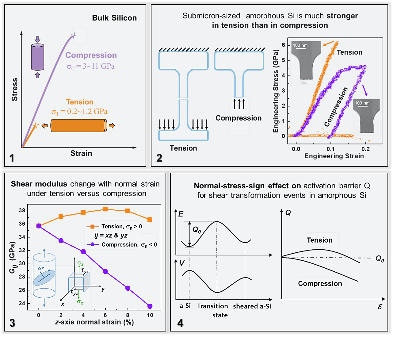 图(1) 块体硅材料的拉伸和压缩曲线;图(2)同一非晶硅“拉-压”微样品上先后进行拉伸和压缩测试;图(3)非晶硅在拉应力和压应力下的剪切模量随应变量的变化;图(4)非晶硅发生剪切塑性转变所需要克服的能垒,随拉-压应变发生很不相同的变化。