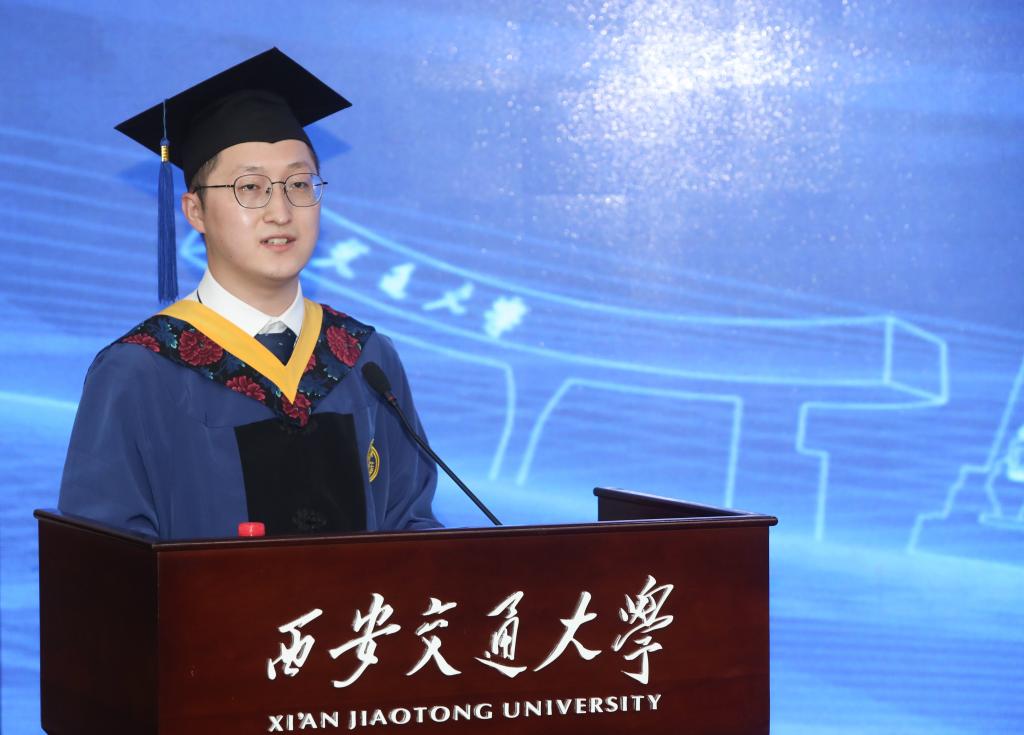 硕士毕业生代表侯鑫广分享了在参与创新港建设和校园疫情防控后对爱国主义、集体主义、英雄主义和乐观主义的深刻感悟。他讲到,建设创新港是每一个交大人的使命,是“西迁精神”指引下爱国主义的最新诠释。倡议同学们做“在爱国的集体里做乐观的英雄”,无论未来遇到何种困难,都不忘初心,乘风破浪。