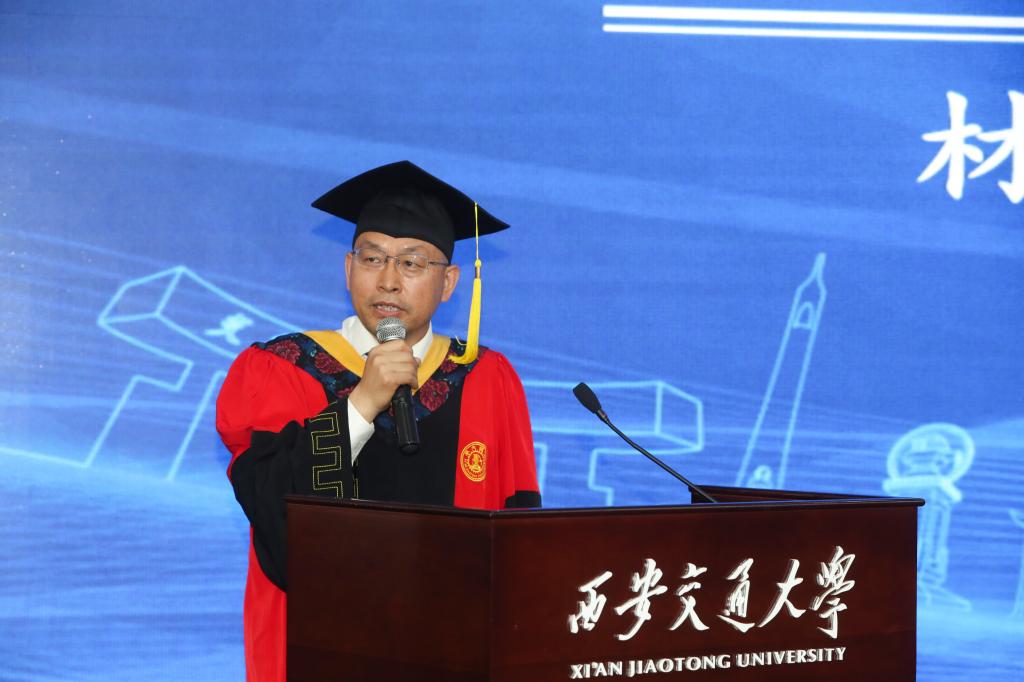 党委书记潘希德在致辞中回顾了2019级研究生参与建设创新港的场景,阐述了疫情封控期间同学们的成长与优异表现,并对同学们的付出与坚守表达了由衷的感谢。围绕“爱校”“坚韧”“感恩”三个关键词,表达了对同学们的期许和祝愿。一是修一颗爱校之心,做永远的交大人和材料人;二是修一颗坚韧之心,不惧困难,勇于挑战;三是修一颗感恩之心,勿忘家国,常怀仁爱。希望毕业生们踏实做好每一件小事,积累每一个微小的成就,最终活成自己想要的模样。
