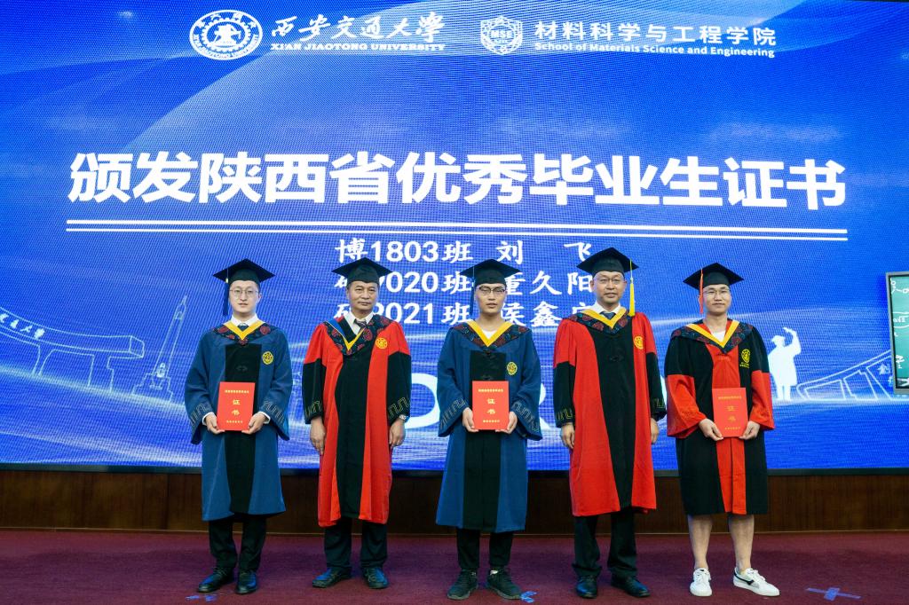 党委书记潘希德与院长单智伟为2022届陕西高校优秀毕业生刘飞、董久阳、侯鑫广三位同学颁发荣誉证书。鼓励毕业生同学们不负韶华,不负时代,不负人民,不懈奋斗,在青春的赛道上跑出自己的最好成绩。