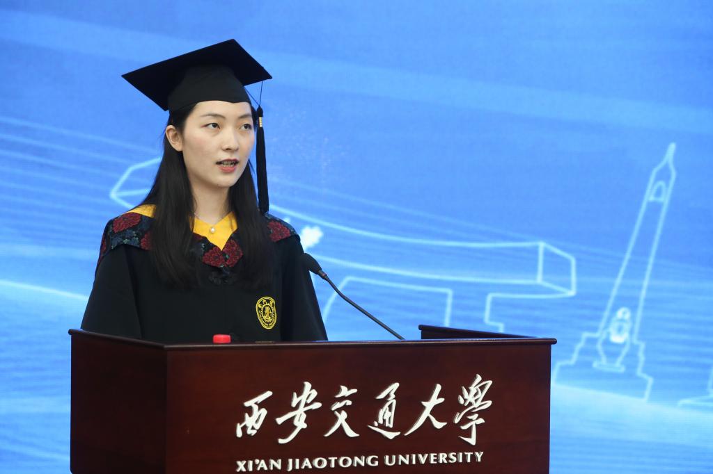 即将赴清华大学攻读硕士学位的本科毕业生代表刘畅分享了她在交大四年的感悟和毕业之际的心情。学院的照顾与培养、老师们的支持与建议和师长们的关心和帮助逐步影响了每一个人气质、态度与价值取向,无论志趣何处,都牢记自己是一名“交小材”,时刻谨遵“为世界之光”、“为材料之光”的志愿与誓言。最后,作为首届越杰班毕业学子,她表达了对蒲忠杰、张月娥、王文斌等材料学科优秀校友的感谢与感激之情。