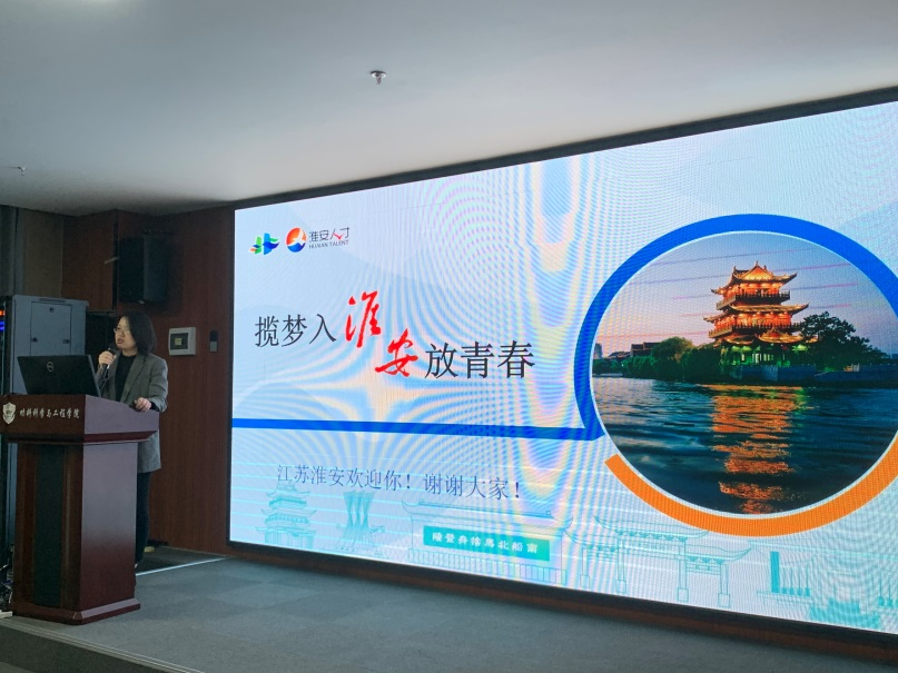 淮安市淮阴区高层次人才储备和发展中心副主任、区委组织部人才工作科科长朱文静用魅力之都、活力之城、理想之家三个关键词,详细介绍了淮阴区的地理位置、城市特色,同时详细介绍了淮阴区的人才政策。