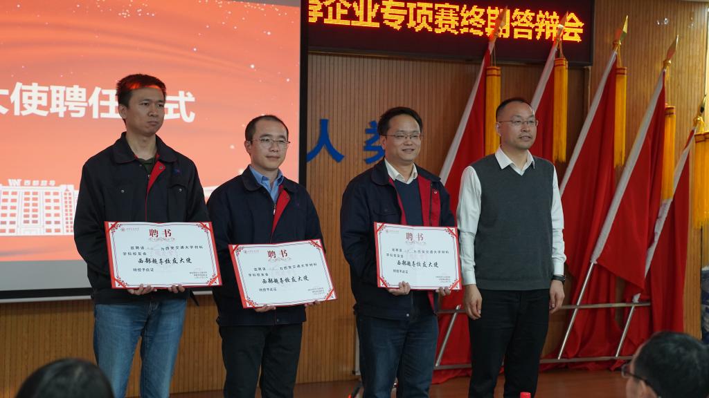 随后,单智伟为在西部超导工作的三位交大材料校友颁发材料学科“西部超导校友大使”聘书,感谢校友在国家需求的工作岗位上贡献自己的力量。