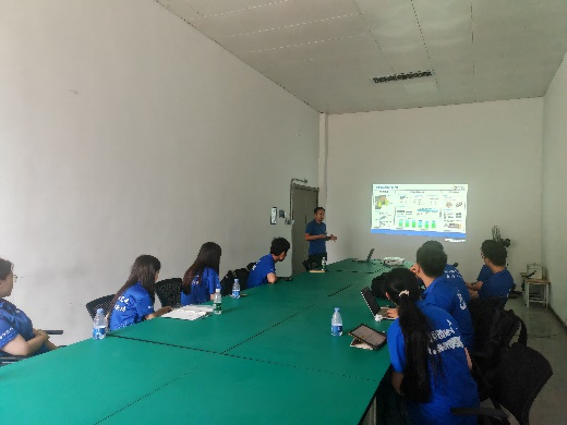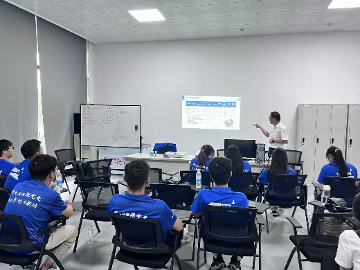 2001级校友李晓军向大家介绍了半成品生产工艺流程及其相关原理;工程师孙琳介绍了湿拉工艺流程及其相关原理;技术中心副主任刘兴华介绍了钢帘线工序分类、产品性能检测方法和智能化生产设备及其原理等相关内容。通过专业讲解,实践团队更加深入地了解了钢帘线产品,学以致用、知行合一,在接下来参观生产车间的过程中能够更加有效地将理论知识与实际生产过程相结合。