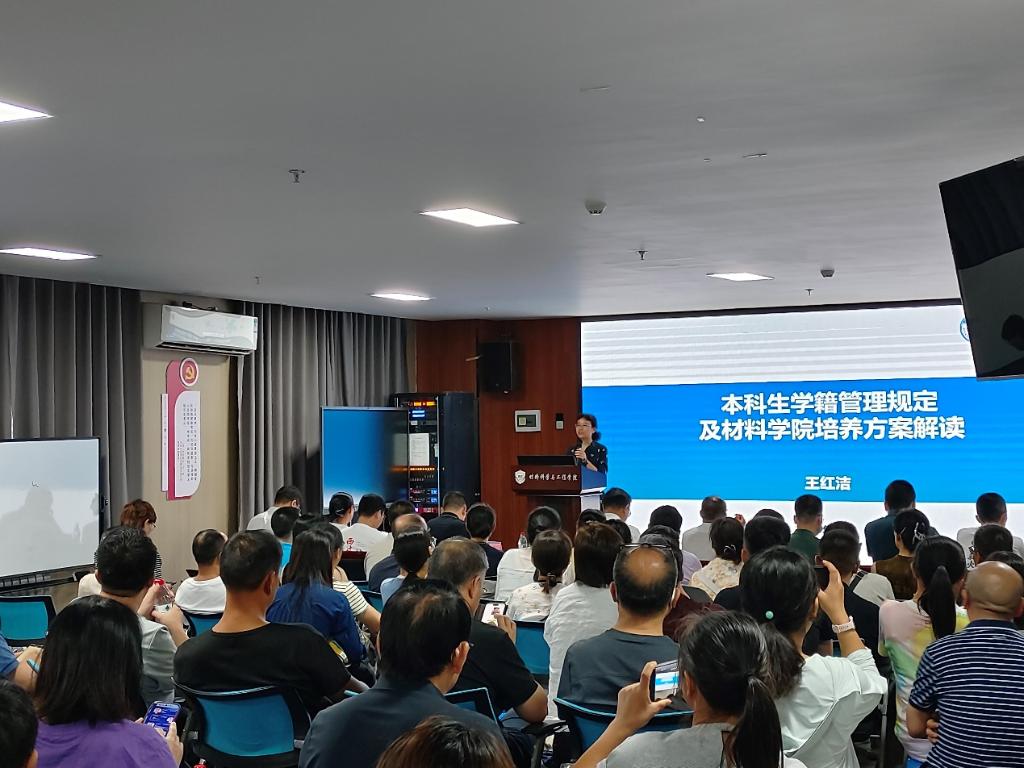 王红洁副院长首先向家长们表示热烈的祝贺和欢迎,并详细介绍了学院的基本情况。她从学院历史渊源娓娓道来,材料学院前身是1952年交通大学机械制造系金相教研室,1956年随校西迁,1994年4月正式建院,不仅创建了新中国首个金属材料及热处理专业和铸造专业,更涌现出周惠久、涂铭旌、李鹤林、孙军等学科开拓者和奠基人,西迁精神与学术基因在此代代相传。2019年7月,学院在中国西部科技创新港成立材料科学与工程研究院,建成国内顶尖、国际一流的材料实验研究共享示范基地,为学科发展注入新动能。学院以“四个面向”为指引,深耕学术前沿与国家需求,致力于培养顶尖人才。此外,王院长详细解读学校学籍管理规定与2023版专业培养方案,恳切希望家长在深入了解学院的基础上,与学院同向发力,培育全面发展的栋梁之才。