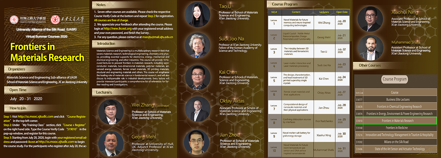 其中,材料领域相关课程Frontiers in Materials Research将由“丝绸之路大学联盟—材料子联盟”(MSESA-UASR)组织。本课程将通过10次专题报告的形式介绍前沿材料学研究,内容涵盖半导体芯片材料、二维材料、高分子材料、先进能源材料、铁性智能材料、3D打印材料、结构工程材料等。