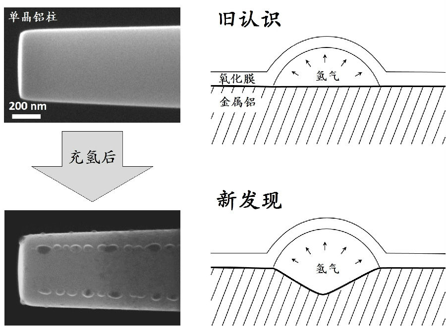 微纳中心的研究人员通过将传统的楔形样品改为柱形样品,成功地观察到了铝和其表面氧化物界面上氢泡的成核与长大全过程。结果发现,电子束可以是氢分子变身为氢原子,而氢原子小巧的身躯使得她能够在表面氧化层中来去自如。而一旦进入到铝和氧化铝的界面,氢原子就会大大削弱铝和氧化铝的键合强度,并使得临近界面处的铝原子脱离束缚自由迁移。在表面能最小化的驱动下,首先在铝一侧形成一些由低能晶面所界定的小坑。当这些小坑长大到临界尺寸后,其空间内重新复合的氢分子所产生的压力将足以使得表面氧化层发生塑性变形,并形成气泡,而这些气泡的位置和大小具有显著的晶体学取向依赖性!氢致界面失效是常见的金属材料失效原因之一,涉及到石化、海洋、核、航空航天、半导体等重要工业领域。上述发现期望对所有氢致界面失效的防护具有重要的启示意义!