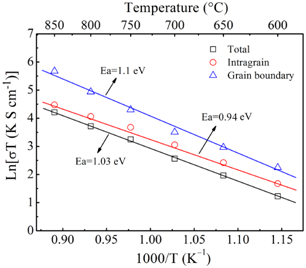 图2 HVOF制备的LSGM电解质电导率