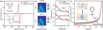 金属材料强度国家重点实验室有机光电子材料及界面课题组(LOGIC)根据有机光伏材料杂原子上普遍含有孤对电子的特点,以含有空轨道的路易斯酸-三(五氟苯基)硼烷作为新型掺杂剂,开展了体相异质结掺杂有机太阳能电池的研究。路易斯酸碱反应掺杂中的转移电荷来自于杂原子上的孤对电子,避免了掺杂对有机半导体材料共轭结构的破坏;同时基于轨道杂化的掺杂机理,突破了传统的能级限制,有效扩展了掺杂材料的选择范围。器件研究表明该种掺杂剂对富勒烯及非富勒烯有机太阳能电池均具有性能提升的作用。结合同步辐射技术,研究人员进一步发现路易斯酸掺杂剂在电子结构调控之外还具有活性层纳米结构调控的作用。三(五氟苯基)硼烷能有效提高富勒烯及非富勒烯受体材料的结晶性,从而对体相异质结材料的相区尺度和纯度进行优化调控。这项工作为活性层掺杂有机太阳能电池性能的进一步提升提供了新的策略。