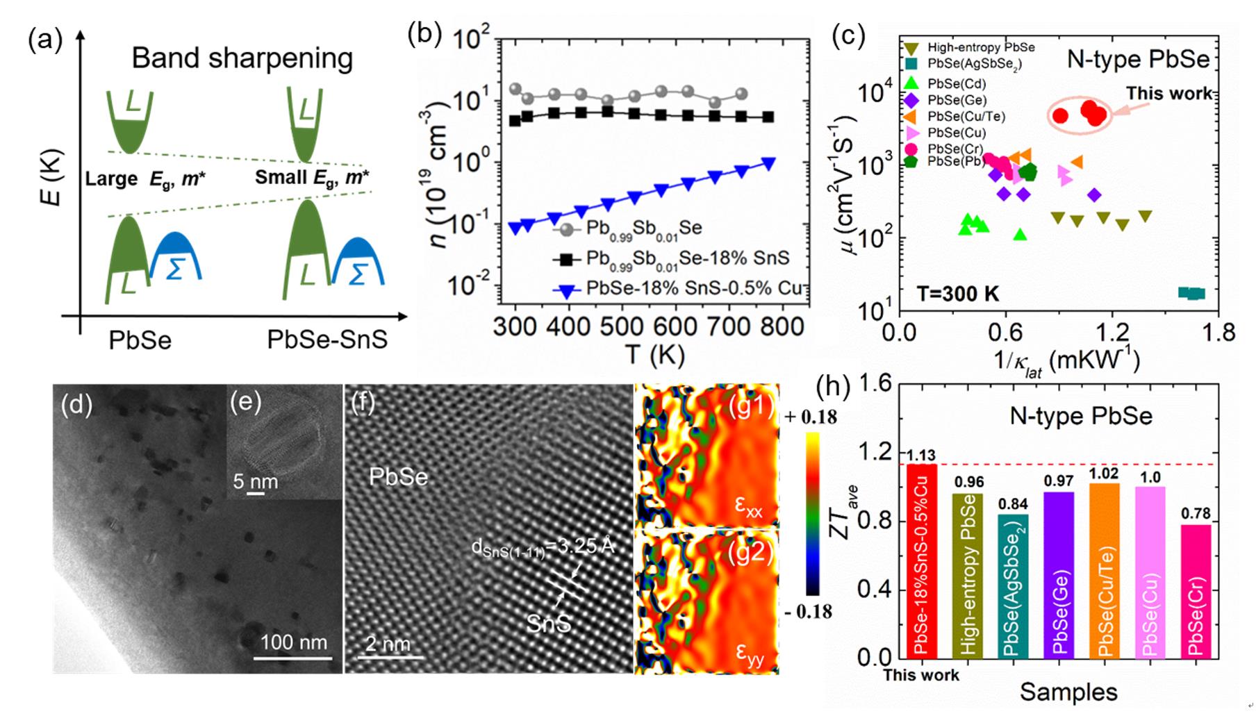 图例:(a)PbSe-SnS中能带形状锐化,(b)Cu间隙原子动态掺杂;(c)室温载流子迁移率与晶格热导率;(d-g)PbSe-18%SnS-0.5%Cu样品中的半共格界面;(h)平均ZT值对比。