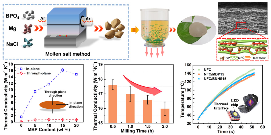 夏鸿雁副教授课题组通过低成本熔盐法成功合成了BP粉体颗粒,随后将BP颗粒作为导热填料,与纳米纤维素通过真空抽滤的方法制备得到BP /纳米纤维素复合薄膜。复合薄膜中BP与纳米纤维素通过氢键结合,进而有效降低了两者间的界面热阻。除此之外,结构中BP颗粒相互接触,在面内形成短程有序排列,与纳米纤维素形成了有效的导热通道,这极大地提高了聚合物复合材料的散热能力。BP /纳米纤维素复合薄膜最高热导率能达到17.6 W/m·K,并且具有良好的绝缘性和机械性能。相关工作以“Enhanced thermal management performance of nanofibrillated cellulose composite with highly thermally conductive boron phosphide”为题发表在国际期刊Journal of Materials Chemistry A上,8X8X