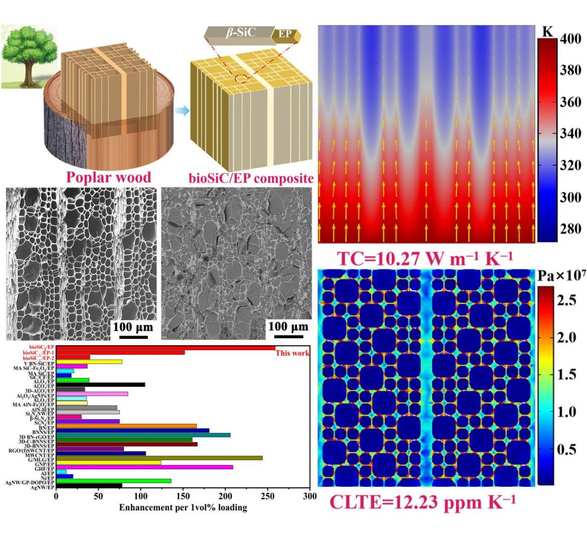 研究人员提出了一种基于木材多尺度结构基元序构的仿生设计思路,采用生物模板陶瓷化技术结合真空浸渍法,在环氧树脂基体中构建了具有各向异性的碳化硅导热框架,该3D框架不仅具有轴向的高度定向排列性,且其内部相邻的纳米SiC晶粒紧密接触,界面热阻低;另一方面,该框架在径向具有限制高分子链热运动的蜂窝网络结构。借助SiC高热导的属性和仿生结构的特点,复合材料在实现轴向热导率有效提升的同时(热导率为传统SiC颗粒弥散分布复合材料的20倍,导热增强效率高达259),获得了极低的径向热膨胀系数以及优异的热稳定性和阻燃性能。