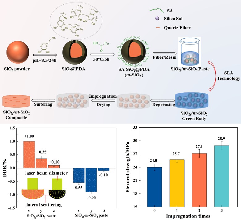 鲍崇高教授团队采用聚多巴胺对熔融石英(SiO2)陶瓷进行表面包覆改性,取代了传统光固化成型膏料制备所需的分散剂和吸光剂,制备了基于光固化成型(SLA)技术的SiO2f/m-SiO2陶瓷膏料。所制备的SiO2f/m-SiO2陶瓷膏料具有优异的流变特性和更高的成型精度。采用光固化成型结合硅溶胶浸渍技术对SiO2f/m-SiO2复合陶瓷进行浸渍处理对SiO2f/m-SiO2复合陶瓷的力学性能进行改善。结果表明,当浸渍次数为3次时,SiO2f/m-SiO2复合陶瓷的力学性能得到较大提升,其中弯曲强度增幅约20.4%,压缩强度增幅约42.0%。