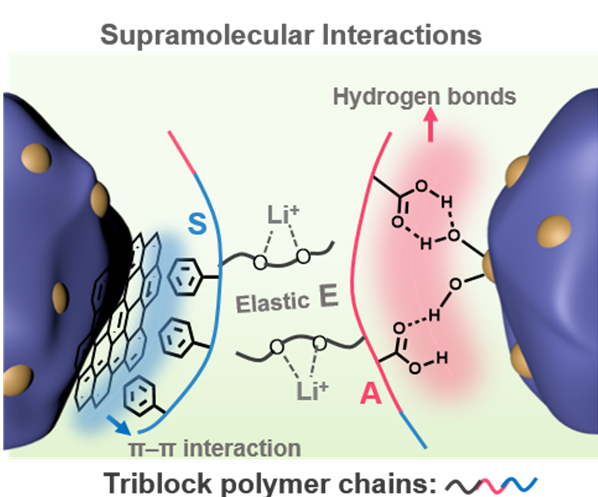 此外,课题组针对锂离子电池新一代高比容硅碳负极开发了一种界面适应型粘合剂解决因其大体积形变导致的容量快速衰减难题。所开发的三嵌段聚合物粘合剂PSEA由疏水的聚苯乙烯嵌段(S)、弹性的聚(2-(2-甲氧基乙氧基)乙酯(E)嵌段和亲水的刚性聚丙烯酸嵌段组成。与传统的硅基负极粘合剂不同,新型界面适应型粘合剂能够通过π∙∙∙π堆叠和氢键相互作用与C层和Si层结合,有效地促进界面粘附以及电极各组分在浆料中的均匀分散,进而维持电极组颗粒间的连接和电极的完整性。此外,粘合剂中柔性的聚醚侧链及其丰富的配位位点还可以促进聚合物链中锂盐的解离,加速Li+传输。得益于此,即使高面容量下,所制备的硅碳负极仍表现出优异的电化学循环性能。相关工作以《基于超分子相互作用的界面自适应粘合剂在锂离子电池高比容硅碳负极中的应用》(Interface-Adaptive Binder Enabled by Supramolecular Interactions for High-Capacity Si/C Composite Anodes in Lithium-Ion Batteries)为题发表在国际知名期刊《先进功能材料》(Advanced Functional Materials)上,8X8X