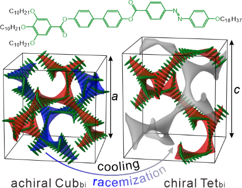 RSoXS是一种利用线偏振X射线在元素吸收边附近进行散射的实验方法,其物理过程包含散射与吸收两部分,散射为该实验方法提供识别周期性的能力,吸收过程使得电子跃迁至外层非球形轨道中,使得不同方向的轨道与线偏振X射线的作用方式不同,从而赋予了RSoXS分辨电子轨道/价键方向周期性的能力。借助于这种特性以及原位温度敏感性分析,研究人员成功地表征了手性四方结构(Tetbi),并通过简化的结构模型,结合散射理论,对手性四方结构中的分子排布方式进行了解析。揭示了从非手性立方结构(Cubbi)到手性四方结构(Tetbi)的手性产生过程。随着温度的降低,一条网络中的分子保持螺旋排布,而另一条网络中的分子逐渐随机,从而自发产生了超分子手性。这一发现首次解析了三维体系中超分子手性的自发产生过程,探究了分子螺旋间的相互作用对超分子手性的影响,拓宽了超分子手性体系的表征思路。