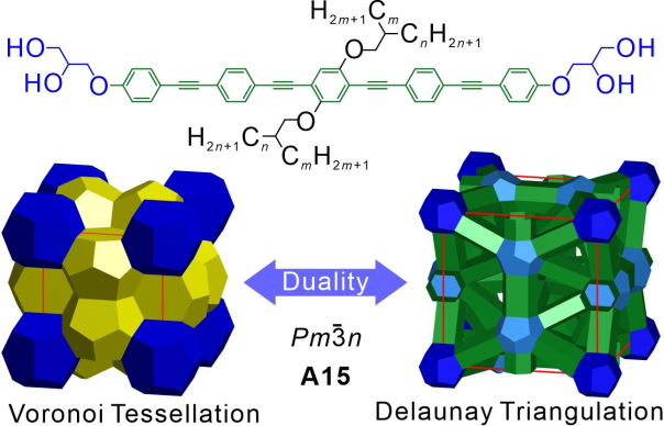 刘峰教授团队与德国哈勒维滕贝尔格马丁路德大学Carsten Tschierske教授合作,在以棒状基元为核心的不对称星形多亲性分子中,首次发现基于四面体网络结构的A15立方相。分子结构如图所示,核心为棒状低聚亚苯基亚乙炔基(OPE),两端为极性的丙三醇形取代基,侧链为非对称支化脂肪链。通过运用差示扫描法、偏光显微镜以及同步辐射小角X射线散射等测试方法,对该结构进行了详细的表征和分析。该结构对应于A15晶胞的德洛奈三角剖分(Delaunay Triangulation,DT),为常见Weaire-Phelan结构的拓扑学对偶,因此通过适当的拓展可以制备其它结构的FK相甚至液态准晶结构。