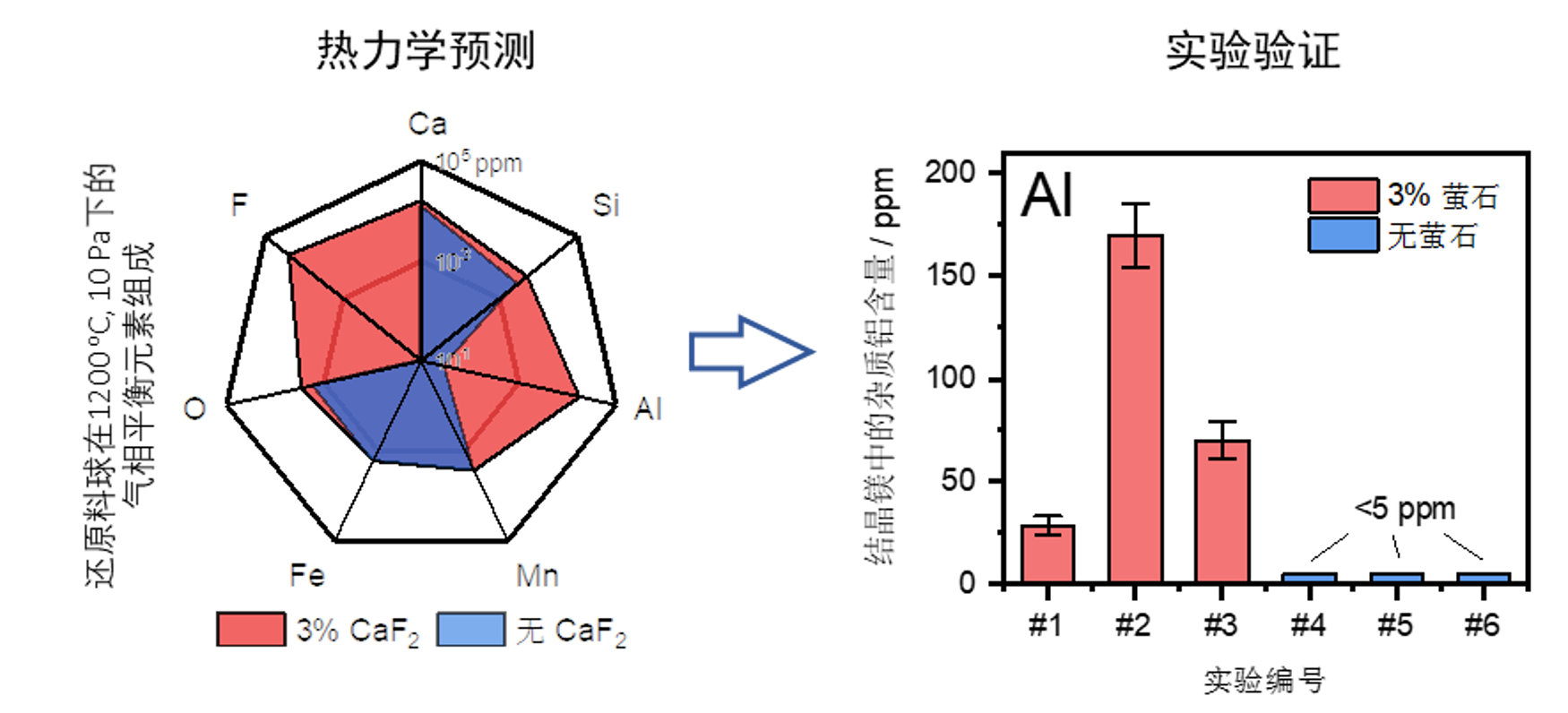 通常来讲,催化剂只改变反应速率,不影响反应平衡,因此在前面的计算中并没有考虑催化剂萤石的影响。在排除煅白和硅铁的影响之后,作者团队抱着尝试的心态在原系统中加入了萤石,重新进行了计算。令人意外的是,他们发现气相产物中的铝含量大幅提高,超过了硅、锰含量,且铝的主要存在形式是一氟化铝气体(AlF)。为了验证计算结果的可靠性,作者团队设计了严格的对照实验,以添加/不添加萤石作为实验的唯一变量进行对照实验。实验结果确认了计算结果的可靠性——萤石的确是导致原镁中杂质铝含量高的“罪魁祸首”。此外,结合热力学分析和料球内各原料的大小和空间分布,作者团队分析了铝含量波动大的可能原因,阐明了气态杂质铝进入结晶镁的方式。作者团队最后指出,可以通过减少甚至弃用萤石粉来制备具有超低铝杂质含量的金属原镁,进而制备出能满足高纯钛需求的具有超低铝杂质含量的海绵钛。