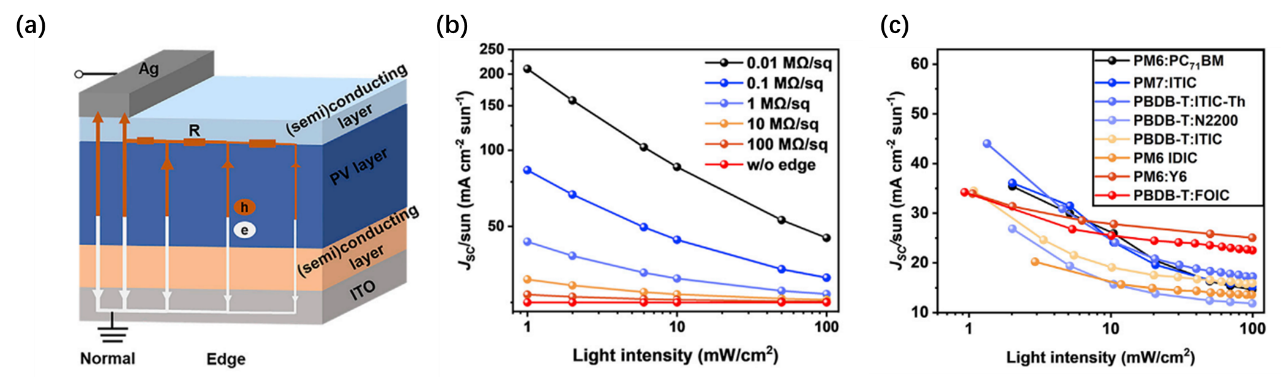 金属材料强度国家重点实验室赵超博士和马伟教授分析认为,决定电学边缘贡献的关键物理参数是电压分布而不是电阻。随着光照强度降低,光电流减小,器件边缘的电压分布变宽,有效边缘面积增大,导致器件的有效面积增大,造成弱光下Jsc高估。基于上述分析,研究团队提出等效电路模型,以研究光照强度和器件表面电阻对电学边缘效应的影响。计算和实验结果表明,当界面电阻为1MΩ/sq时,在标准光照下(1 sun),边缘效应很小;然而,在低光照下(0.01 sun),边缘效应将导致Jsc高估>70%,PCE高估>22%。该机制适用于所有类型的光伏器件,包括有机太阳能电池,钙钛矿太阳能电池,染料敏化太阳能电池。此外,电学边缘效应通常被认为只发生在具有导电层的器件中,本研究揭示非导电层的界面掺杂也能造成明显的电学边缘效应:在0.01 sun光照下,Jsc高估51%,PCE高估15%。相比导电界面层,界面掺杂引起边缘效应从未被关注,也极易被忽视。进一步地,研究团队发现随着表面粗糙度的增大,界面电阻减小,导致更强的边缘效应。基于以上结果,研究团队提出增加器件的有效面积、降低表面粗糙度、使用掩膜、设计无边缘器件结构,以避免电学边缘效应导致Jsc高估和PCE高估。该工作为电学边缘效应的内在机制及其对器件性能评估的影响提供了新见解,有利于促进室内光伏器件研究领域的健康发展。