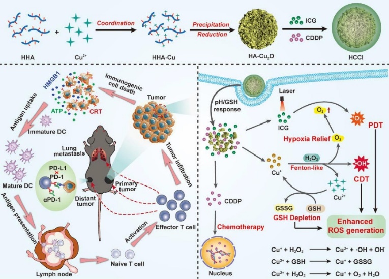 4.铜纳米酶/光动力学疗法增强PD-1免疫治疗。通过铜-酰肼配位及原位矿化技术制备了叶片状铜纳米酶,其具有肿瘤微环境响应性降解行为和类芬顿/类谷胱甘肽氧化酶/类过氧化氢酶三重酶活性。该纳米酶能通过生成大量活性氧以消除原发性肿瘤并诱导肿瘤细胞免疫原性死亡,从而有效抑制远端肿瘤生长和肿瘤肺转移。该成果以"Copper coordinated nanozyme-assisted photodynamic therapy for potentiating PD-1 blockade through amplifying oxidative stress"为题发表于Chemical Engineering Journal(IF=16.744)上。论文第一作者为8X8X