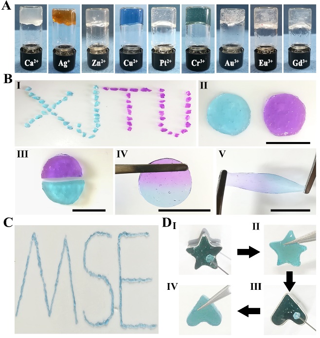 图3(A)酰肼化透明质酸和不同金属离子配位形成的凝胶图片;铜-酰肼凝胶的(B)自愈合性、(C)可注射性和(D)适形性。