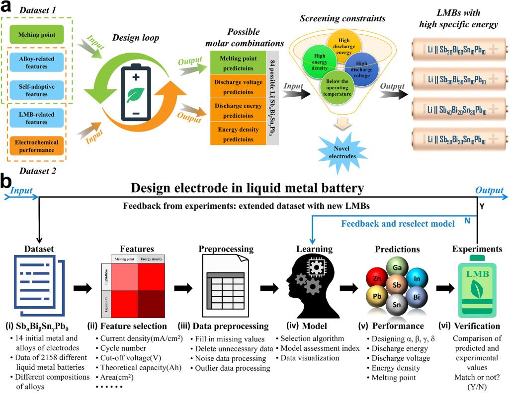 针对上述问题,团队全面总结和收集了现有锂基液态金属电池的各项数据,提出一种基于实验验证的循环设计方法,通过机器学习加速设计具有综合优异性能的新型四元合金电极。在每一次循环中,团队不断扩充并逐渐开发了一个高质量的液态金属电池数据集,其中设计了41种不同特征作为有效的输入参数,从而显著提高了模型的预测能力,并选择适当的机器学习算法来准确预测熔点、放电电压、放电能量和能量密度,实际的预测误差仅为0.17%-7.38%。最终设计的Li||Sb-Bi-Sn-Pb液态金属电池具有低熔点(<500℃)、高库仑效率(~99%)、高能量效率(~87%)和高能量密度(~280 Wh /kg),是一种极具吸引力的储能候选技术。该方法超越了传统电极设计的局限性,表现出巨大的潜力,同时也为多元合金化电极的设计提供了新的思路。