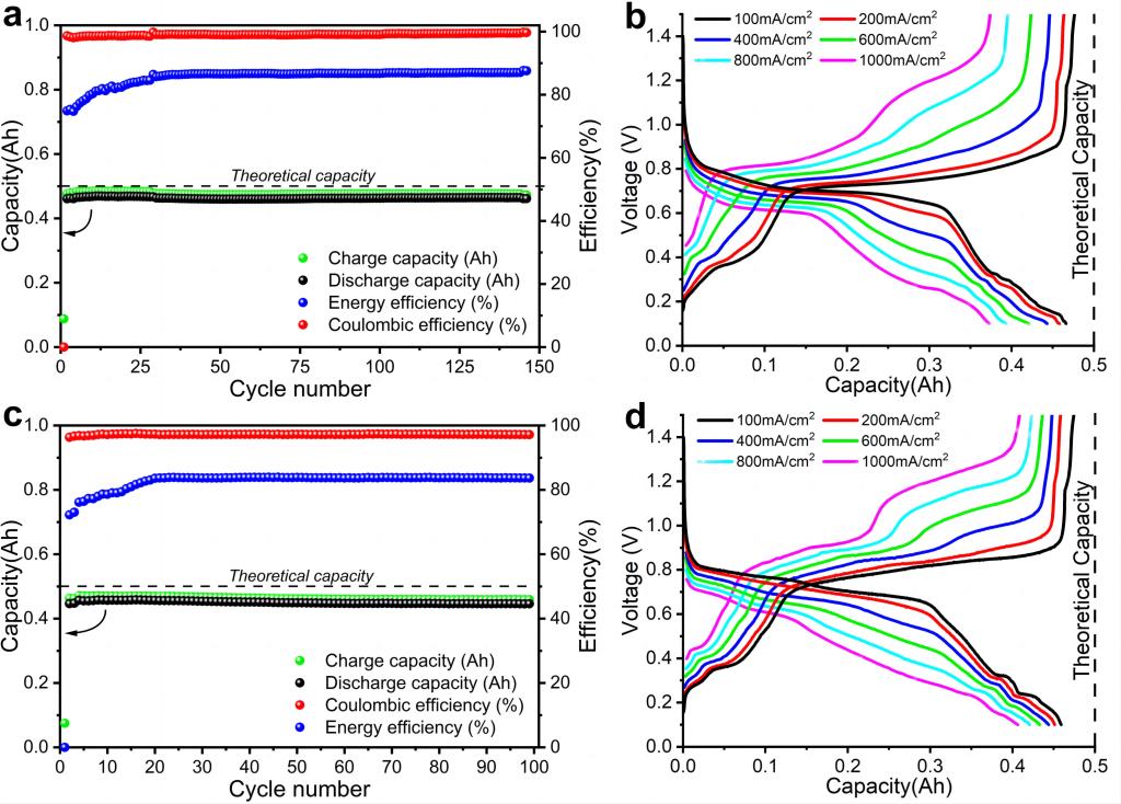 最终筛选出的Li||Sb20Bi60Sn10Pb10和Li||Sb50Bi30Sn10Pb10液态金属电池具有综合优异的性能,并通过0.5 Ah 级别液态金属电池进行测试验证,如图2所示。Li||Sb20Bi60Sn10Pb10电池在500℃运行温度下以100 mA cm-2稳定运行150循环,平均放电容量为0.47 Ah,库伦效率为99%,能量效率为87%,放电能量可达0.28Wh,即使在大电流密度下(1000 mA cm-2),其能量效率也接近60%,具有优异的电化学性能。而Li||Sb50Bi30Sn10Pb10电池则具有最高的能量密度(~280 Wh/kg)和最低的成本(~70 $/kWh),其库伦效率为98%,且在大电流密度下(1000 mA cm-2),其容量保持率依旧高达90%。