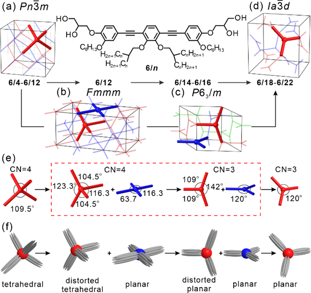 近期,8X8X 8X8X 刘峰教授团队与德国马丁路德·哈勒维腾贝格大学的Carsten Tschierske教授合作,并借助上海同步辐射光源(SSRF)小角X射线散射线站与我校分析测试中心的小角X射线散射仪,研究了一系列多亲性同系物分子在不同温度下的自组装行为,首次提出了一种新的DD-DG相变路径:将DD结构的四面体节点扭曲得到Fmmm结构的扭曲四面体节点和平面四重节点,进一步在六方P63/m结构中变为扭曲的和非扭曲的三重平面节点,最后得到只有非扭曲三重节点的DG结构。相变过程中结构的配位数(CN)的变化为4-4-3-3。相变过程以能量最低为原则,极小曲面与节点的六边形密排互相竞争,得到具有不同节点形状的四种结构。该研究所提出的全新的DD与DG结构之间相变机制,对从结构和分子层面更深入理解相变过程和进一步调控相变具有重要指导意义。