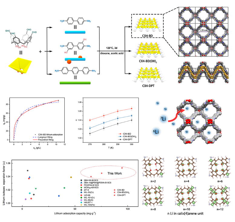 该研究成果以“Calix[4]arene-Decorated Covalent Organic Framework Conjugates for Lithium Isotope Separation”为题目发表于《ACS Applied Materials & Interfaces》上。8X8X 8X8X 硕士研究生哈锐为论文第一作者,刘学特聘研究员、丁向东教授和石伟群研究员为文章的共同通讯作者。8X8X 金属材料强度国家重点实验室为该工作的第一单位。文章合作者还包括8X8X 孙军教授和刘福柱助理教授、西安石油大学何萌讲师、中科院高能物理研究所蓝建慧副研究员以及天津大学王博威副教授。该工作得到了国家自然科学基金和西安交大青拔计划的支持。