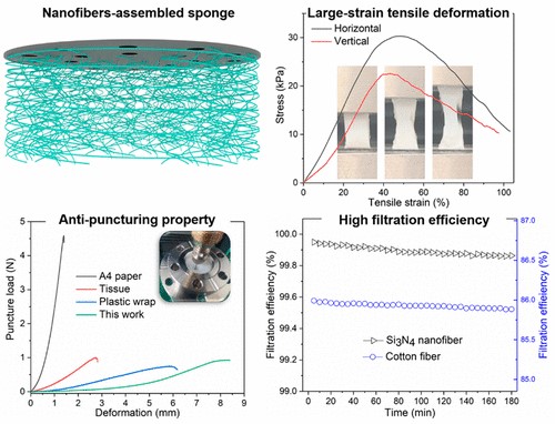 王红洁教授课题组发展了一种可控的化学气相反应方法,开发出一种由取向性高且相互纠缠的氮化硅纳米纤维构筑的超轻陶瓷海绵。该材料不仅具有良好的拉伸(20%拉伸应变下可弹性回复、断裂伸长率高达80%以上)和压缩(80%应变完全回弹)性能,还表现出优异的抗穿刺性。得益于独特的3D网络结构,该陶瓷海绵空气污染物的过滤效率高达99.8%以上,而其压降却仅为棉纤维滤芯的38%。这些综合性能使其具备了在复杂应力条件下的长效空气过滤能力,在空气污染治理等方面具有潜在应用价值。
