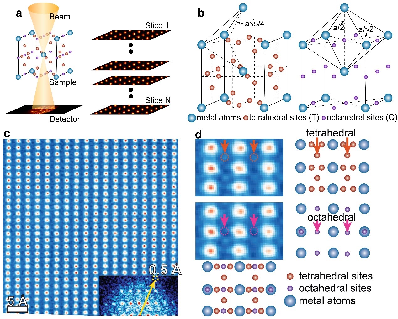 在体心立方(BCC)金属中引入间隙元素(例如铁中固溶氧、碳、氮),是大幅提升强度的有效方法。近期,刘畅等通过将大量间隙氧原子(12 at%)固溶进TiZrNb系中熵合金,将其屈服强度提升至接近理论强度的4.2 GPa(C. Liu et al.Nat. Commun.13, 1102 (2022))。固溶强化效果与间隙原子在晶格中的位置有关。教科书中认为,对于BCC间隙固溶体(比如碳溶于铁而形成的钢),间隙原子位于BCC晶格的八面体间隙位置而不是空间更大的四面体间隙位置(其半径约为前者的两倍),引起不对称的晶格畸变,有效阻碍位错的运动从而提升材料强度。然而,在透射电镜下很难直接观察到金属晶格中原子序数很低的间隙原子,且易受样品表层杂质(如氧化层)的干扰。对间隙原子及其所占位置直接而可靠的观察,将有助于揭示间隙固溶BCC合金的结构特性,促进新一代高强度金属材料的研究与开发