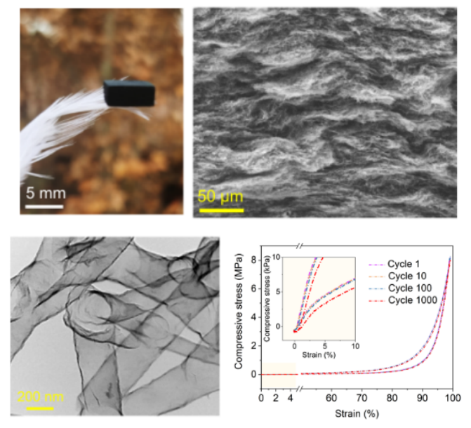碳气凝胶是目前极少数可在极高温度(2000℃以上)无氧环境下保持力学稳定性的气凝胶材料,在国防、能源及智能传感等方面具有广阔的应用前景,但其脆性限制了其广泛应用。近年来,科研人员以石墨烯、碳纳米纤维、碳纳米管等柔性纳米结构为基本组成单元,相继开发出了具有一定压缩回弹特性的气凝胶。但其压缩强度普遍偏低(几到几百千帕),承载能力不足。但提高气凝胶的承载能力,往往又伴随着其变形能力的下降。因此,如何破解高承载和大变形之间的矛盾,进一步提升碳气凝胶的综合力学性能,仍是一个巨大的挑战。