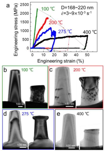 上述发现表明,微纳米尺寸的金属在适当的变形速率和温度下,可以拥有与半固态金属相媲美的优异变形能力。长距离扩散特性可用于加强加载点附近(至少在微米范围内)的金属/氧化物界面,或在不明显改变表面形态或表面尺寸的情况下调整柱子的长度,这在光学纳米柱阵列等器件上具有重要的潜在应用价值。