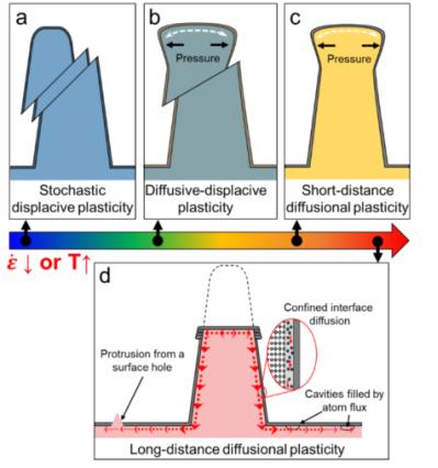 由于铝在表面/界面/晶界的扩散率比给定温度下体扩散率至少高4个数量级,因此原子将优先沿界面扩散,并在某处沉积。通过对圆柱直径的精确测量发现,直径增大不超过一个原子层厚度,由此估算界面原子的扩散范围大于4-12um,是圆柱直径的几十上百倍。如此长的扩散距离与众所周知的短距离扩散型塑性中的仅限于柱体内的扩散范围形成对比,因此是一种由长距离界面扩散主导的塑性变形新机制。