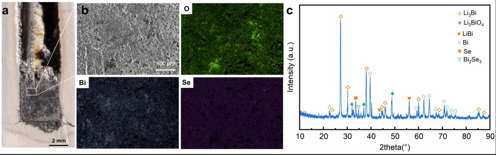 为了阐明Se提高循环性能的机理,对Bi-Se4电极在完全放电后的截面进行表征,结果如图3所示。结果表明:Se添加剂与Bi金属合金化在熔化正极金属的过程中形成了少量的Bi2Se3,进一步证明是通过形成共价键降低了Bi的表面张力;放电产物主要为Li3Bi和少量的LiBi金属间化合物,且Se不与Li发生反应。此外,与纯Bi电极在放电过程中拱起不同,Bi-Se正极的表面平整,这意味着由于润湿性变好产生了均匀的电流分布和更稳定的界面,从而使得放电产物在界面处均匀生长,提升了电池的循环稳定性。