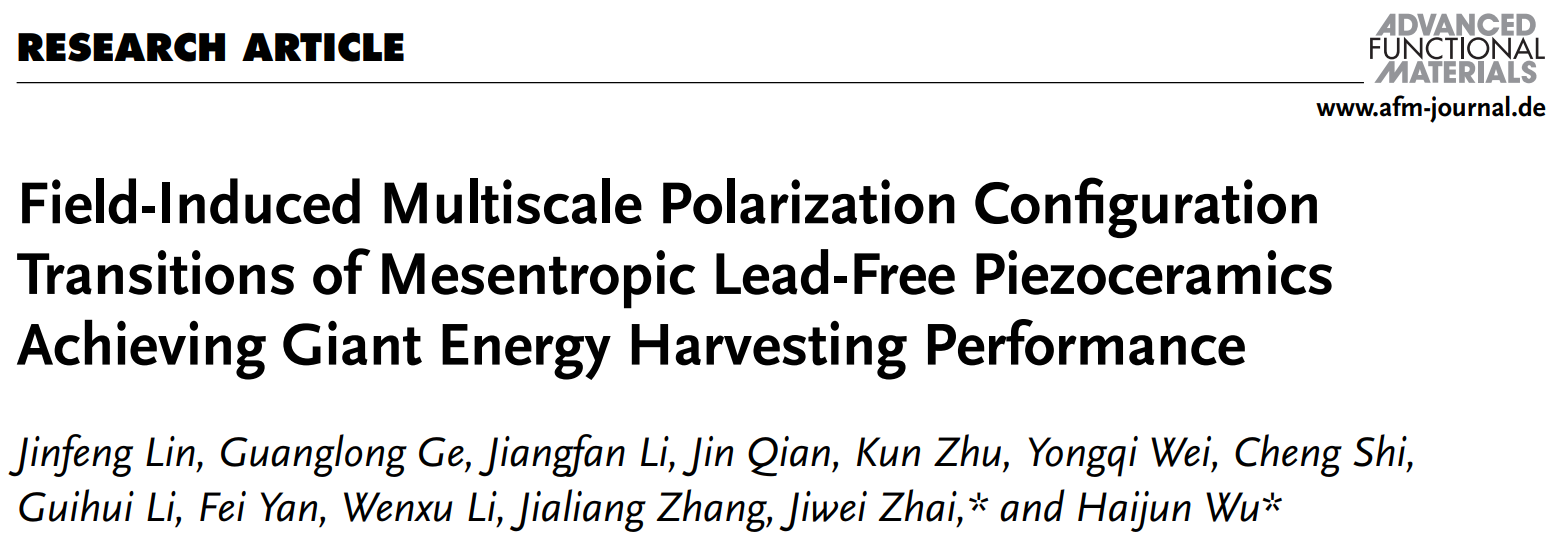 相关成果以“Multiscale reconfiguration induced highly saturated poling in lead-free piezoceramics for giant energy conversion”(《多尺度重构诱导无铅压电陶瓷高度饱和的极化,实现了巨大的能量转换》)为题发表在《Nature Communications》上;相关成果以“Field-Induced Multiscale Polarization Configuration Transitions of Mesentropic Lead-Free Piezoceramics Achieving Giant Energy Harvesting Performance”(《场诱导多尺度极化构型转变调控无铅无压电陶瓷的亚稳相状态,实现了巨大的能量收集性能》)为题发表在《Advanced Functional Materials》上。这两篇工作的通讯作者是同济大学的翟继卫教授和8X8X
