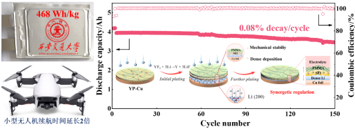 宋江选教授团队提出了一种固体电解质中间相力学和锂晶体学协同调控新方法,通过使用氟化钇/甲基丙烯酸甲酯复合层解决了锂金属负极界面稳定性差的难题。研究人员通过复合层与锂金属的原位反应生成Y掺杂锂金属,诱导锂沉积过程中的晶体学优先取向从传统的(110)晶面转变为(200)晶面,促使锂金属与电解液之间的副反应降低了80%。同时,所采用的活性聚合物复合层兼顾锂离子传输能力和良好的力学性能,可显著改善界面层的离子电导率和机械稳定性。基于上述策略所制备的4.2 Ah大容量软包电池能量密度高达468 Wh kg-1,显著提升了小型无人机的续航时间;且在高面容量正极(6 mAh cm-2)、贫电解液(1.98 g Ah-1)和高电流密度(3 mA cm-2)的苛刻条件下展现出优异的循环稳定性,单圈容量衰减率仅为0.08%。本研究为高比能锂金属电池的开发提供了新的思路。相关研究成果发表在国际知名期刊Nature Communications上,8X8X