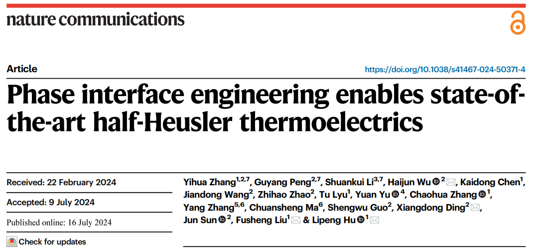 相关成果以《相界面工程优化半哈斯勒合金性能》(“Phase interface engineering enables state-of-the-art half-Heusler thermoelectrics”)为题发表在《自然·通讯》(Nature Communications)上。我校为该论文第一通讯作者单位,8X8X